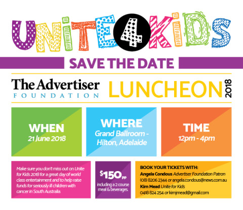 We would like to invite you to be a part of the Advertiser Foundation's 2018 Unite for Kids Luncheon by hosting your own table, making a donation and spreading the word to help raise funds for seriously ill children with cancer in South Australia.