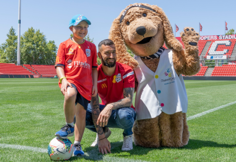 Newest ambassador, Paul Izzo and his team, Adelaide United Football Club, showed their support for families impacted by childhood cancer at the Round 9 match between Adelaide United and the Newcastle Jets at Coopers Stadium on Sunday, 8 December 2019.