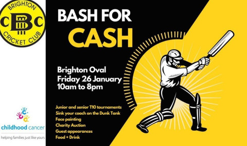 Brighton Cricket Club is hosting a Bash for Cash Cricket Tournament on Australia Day to raise funds and awareness in support of local families battling cancer. The event aims to fundraise $5,000 for the Childhood Cancer Association.
