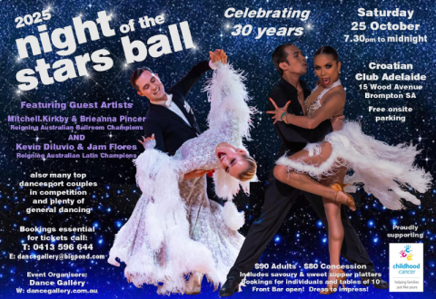 Celebrating its 30th year, the Night of the Stars Ball is organised by Rhett & Kym English of Dance Gallery and held at the Croatian Club Adelaide, the night will also include top dancesport couples in competition and plenty of general dancing.