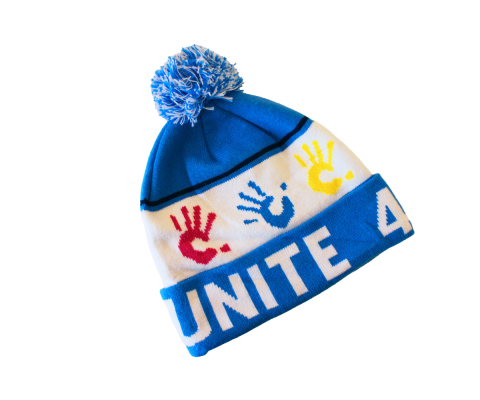 Images showing "Unite 4 Kids" wrapping around beanie: