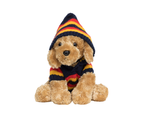 Plush toy dog, Elliot and his knitted Adelaide Crows Football Club hoodie.